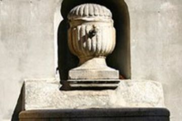 Nel cortile, il mascherone celtico da cui zampilla fresca acqua sorgiva è copia dell'originale custodito nel Palazzo Pretorio. Da S. Pietro si prosegue sulla statale e, protetti dal marciapiede, si riprende dopo una curva l'antico tracciato romano e medievale che porta in paese.