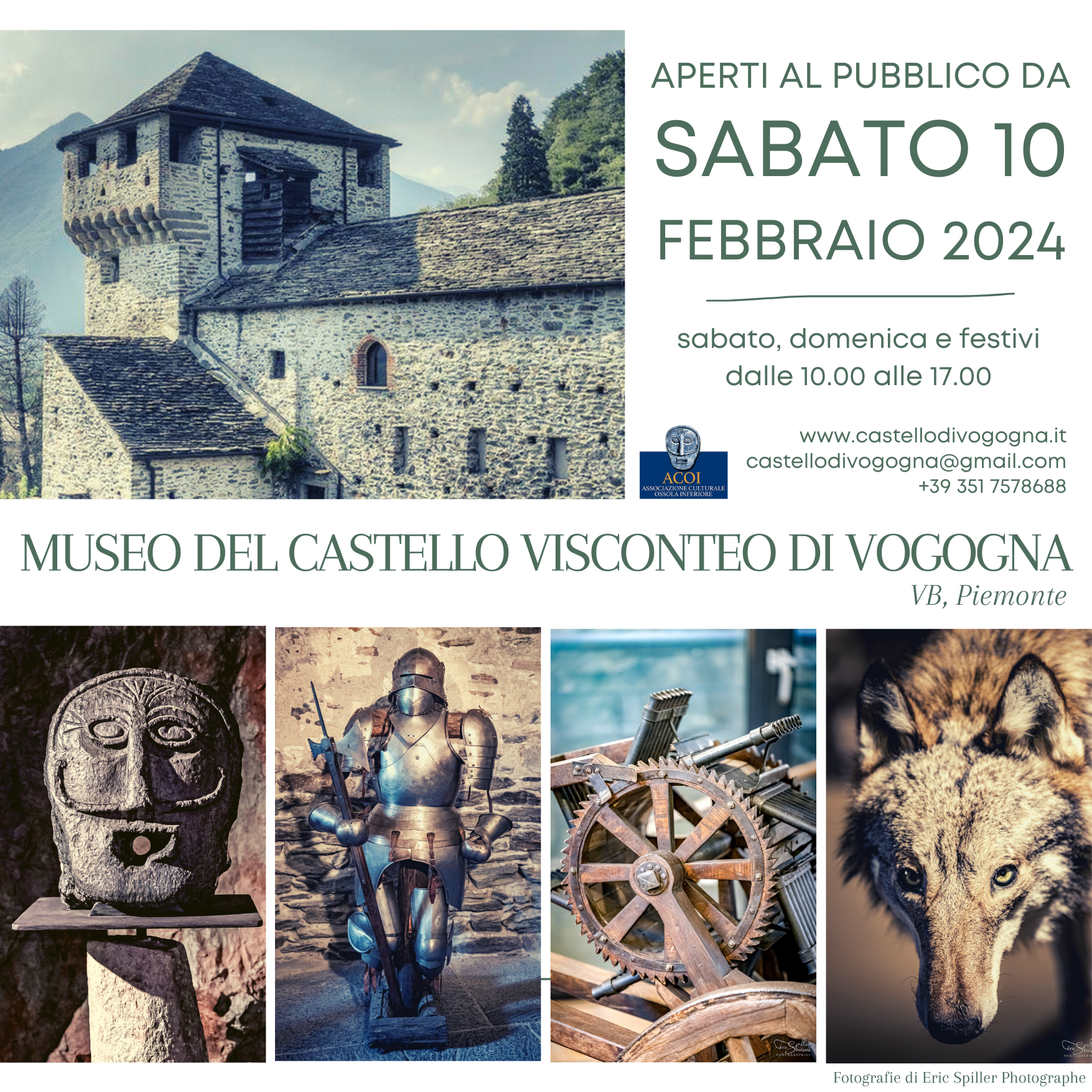 Saremo aperti il sabato e la domenica, festivi e ponti dalle 10.00 alle 17.00 (ultimo ingresso 16.30), la visita al castello è autonoma o su prenotazione al + 39 351 7578688 o castellodivogogna@gmail.com se si desidera un accompagnamento guidato.