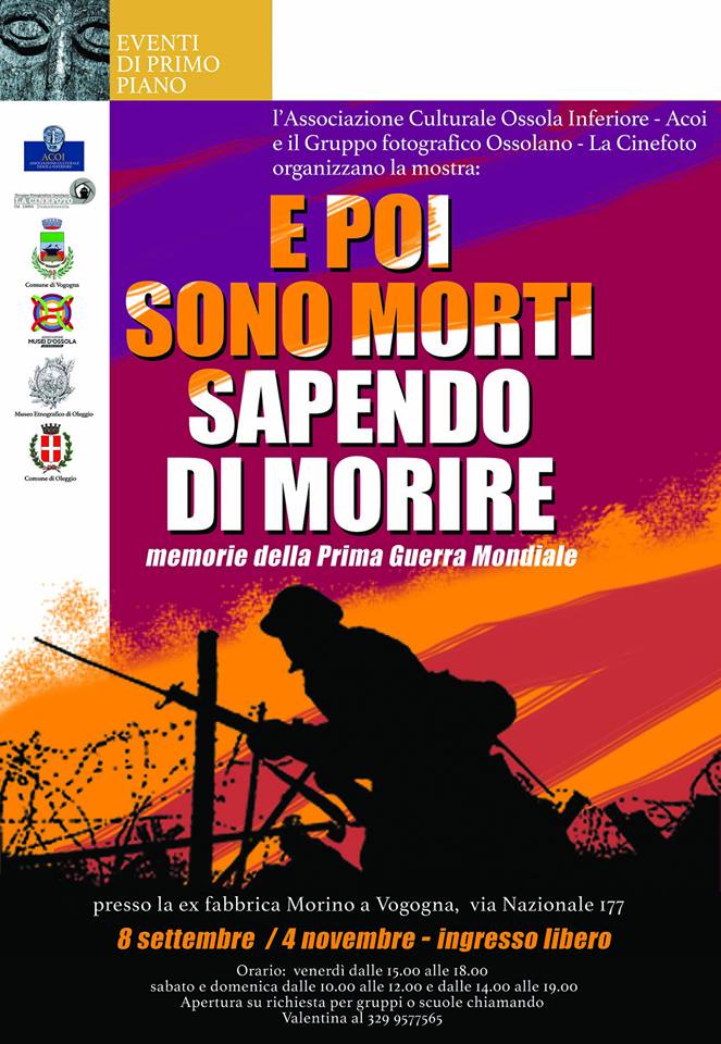 Continua fino al 4 Novembre 2018 la mostra realizzata dall'Associazione Culturale Ossola Inferiore in collaborazione con il Gruppo Fotografico Ossolano La Cinefoto di Domodossola “E poi sono morti sapendo di morire” Memorie della Grande Guerra, presso la Ex Bulloneria “Morino” di Vogogna.