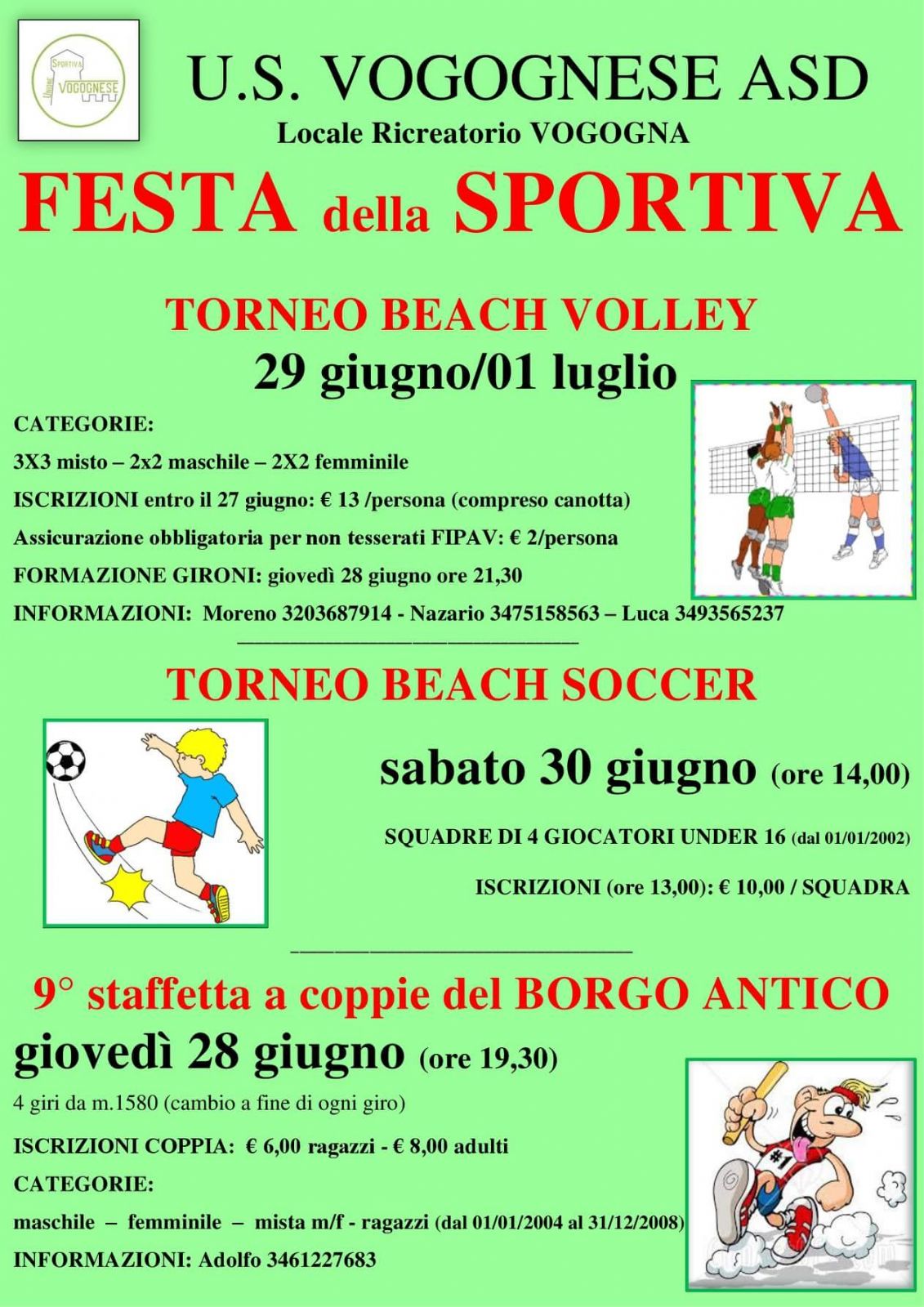 Tornei di Beach Volley (3×3 misto, 2x2 maschile e femminile), di Beach Soccer e l'ormai tradizionale Staffetta podistica movimenteranno le serata vogognesi in quest'inizio d'estate. Vi aspettiamo numerosi!