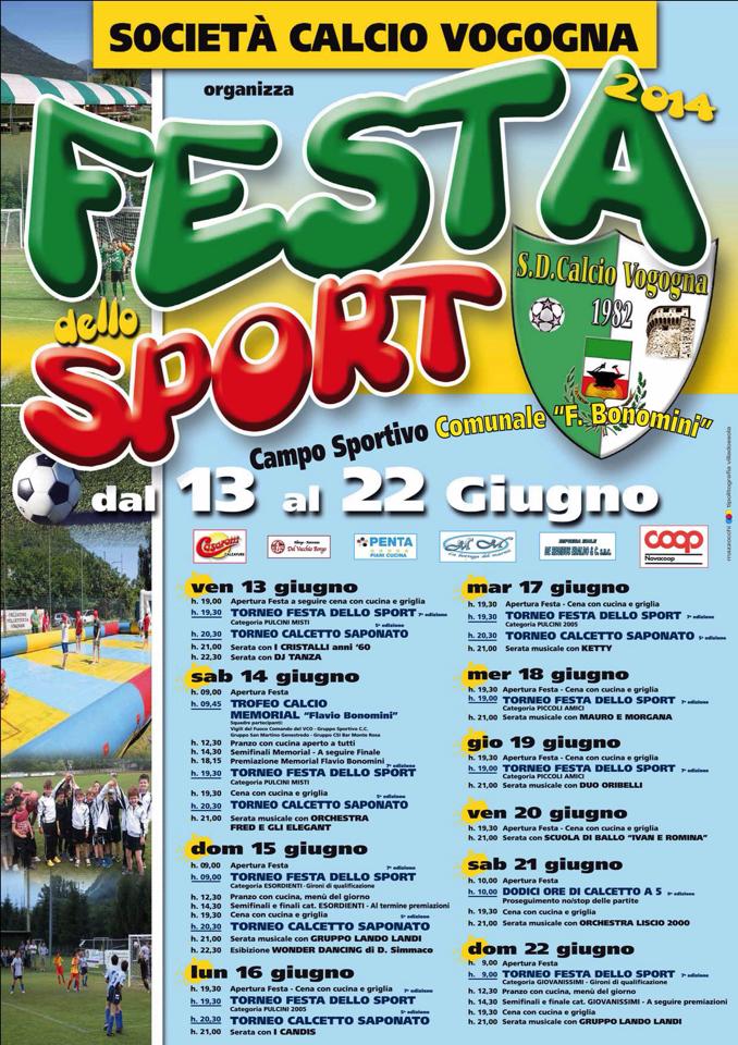 Tornei di calcio e calcio saponato, dodici ore di calcetto a 5, Memorial "Flavio Bonomini", musica e gastronomia, presso il centro sportivo di Vogogna.