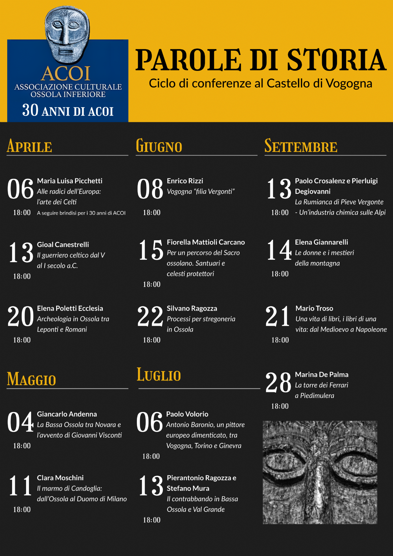 Siamo lieti di presentare "PAROLE DI STORIA", un ciclo di incontri e conferenze che racconta gli aspetti più interessanti e salienti della nostra storia, organizzato per festeggiare i 30 anni dalla fondazione dell' ACOI - ASSOCIAZIONE CULTURALE OSSOLA INFERIORE.