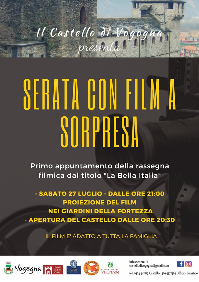 Sabato 27 Luglio al Castello Visconteo di Vogogna inizia la prima edizione della "Rassegna Cinematografica a Sorpresa" che ci accompagnerà fino alla fine dell'estate. Nei giardini del Castello verranno proiettati film a scatola chiusa, GRATUITAMENTE, di cui nessuno sa il titolo: la rassegna "La Bella Italia" vuole far conoscere al pubblico titoli nostrani, italiani, che negli ultimi anni sono diventati dei veri e propri cult... Ma che non hanno avuto la giusta visibilità. Quale altra cornice si sposa meglio dei giardini della nostra fortezza?