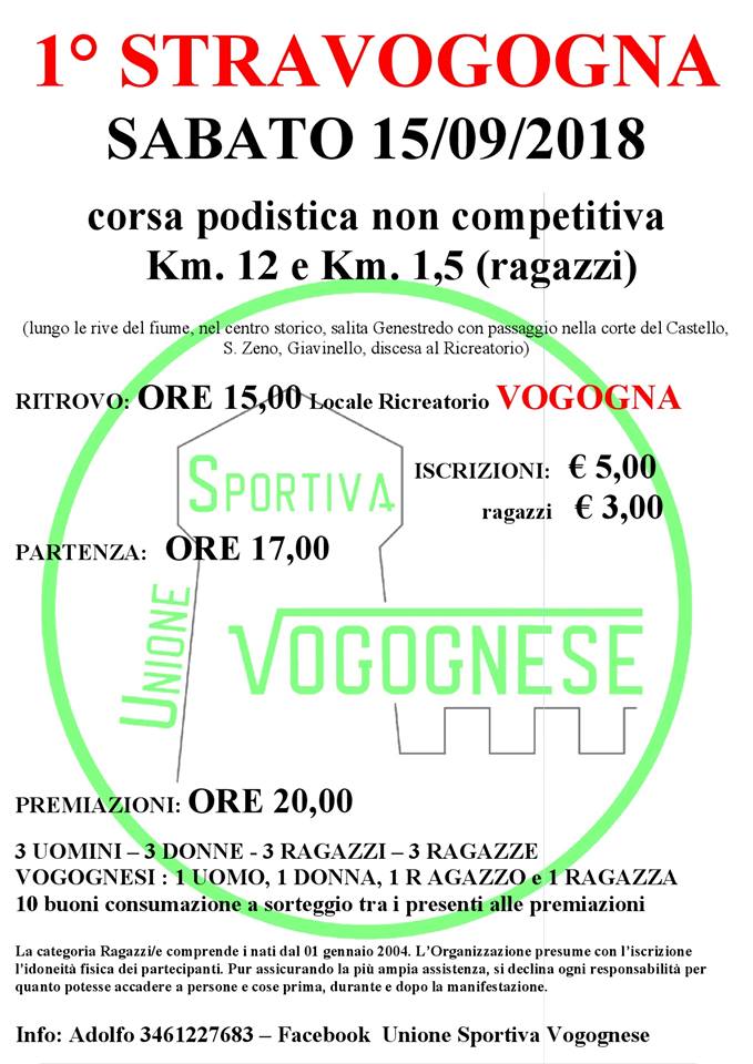 L'Unione Sportiva Vogognese organizza la prima STRAVOGOGNA, corsa non competitiva di Km 12 (Km 1,5 per i ragazzi).