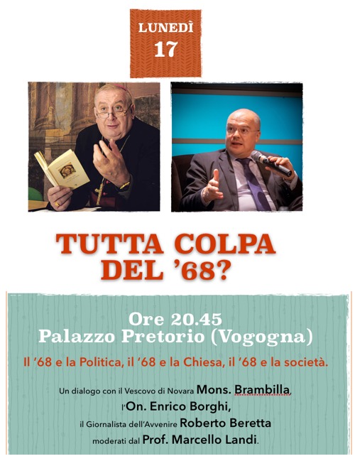 Un interessante dialogo tra il parlamentare Enrico Borghi, il Vescovo di Novara e Vco, monsignor Giulio Brambilla e il giornalista del quotidiano “Avvenire”, Roberto Beretta. A moderare la serata, il professor Marcello Landi. Al centro della chiacchierata il ruolo del ’68 nella politica, nella società e nella religione.