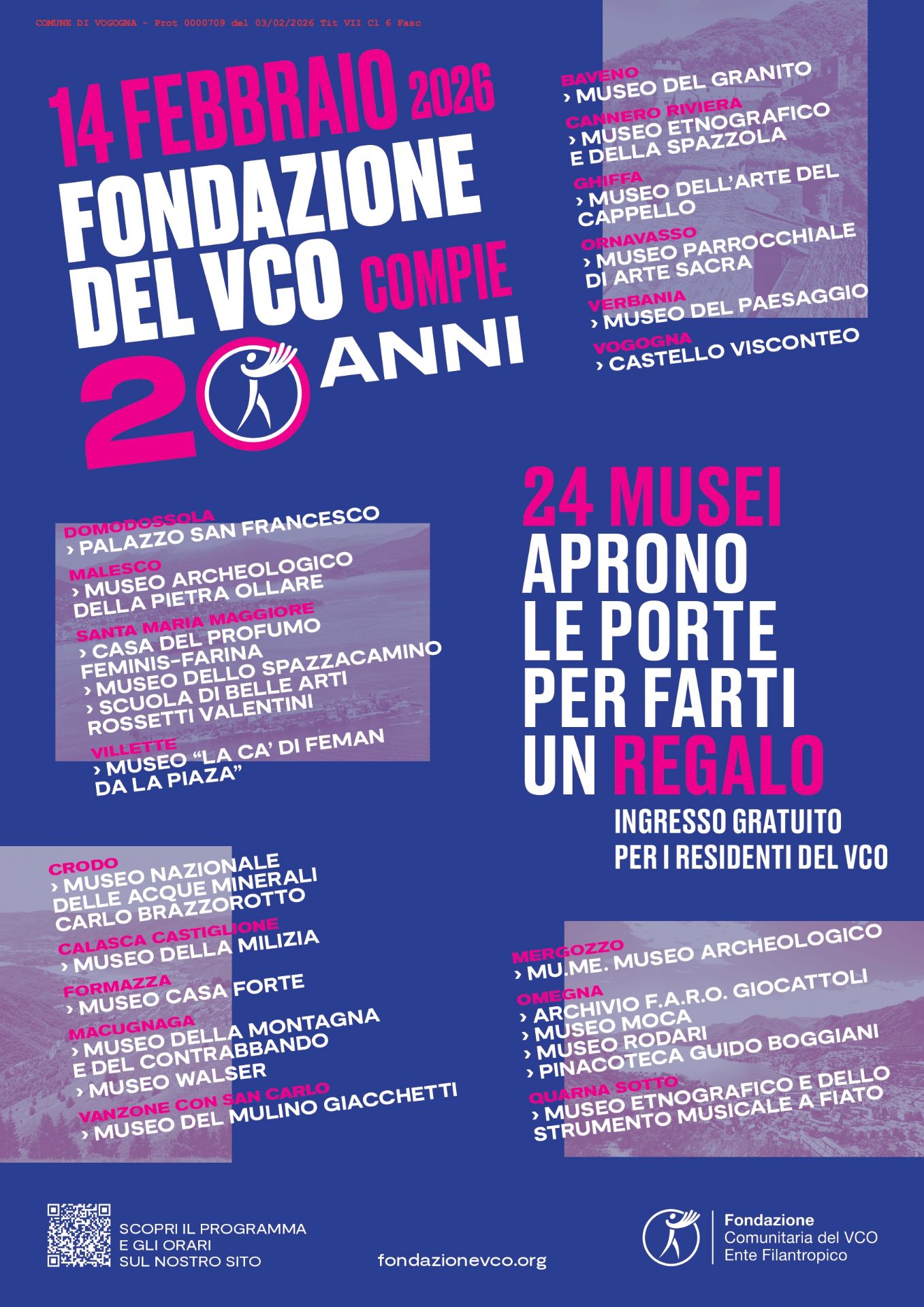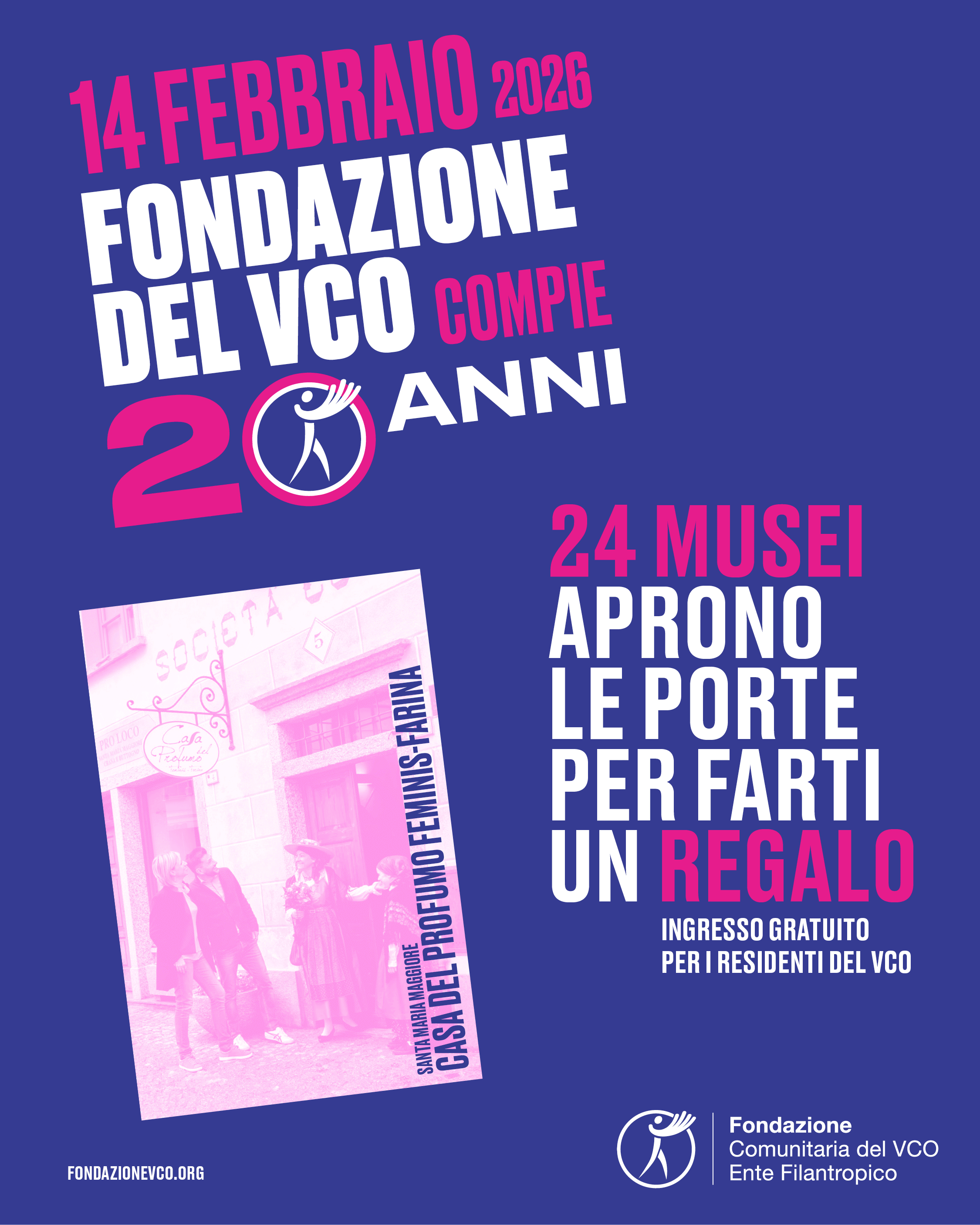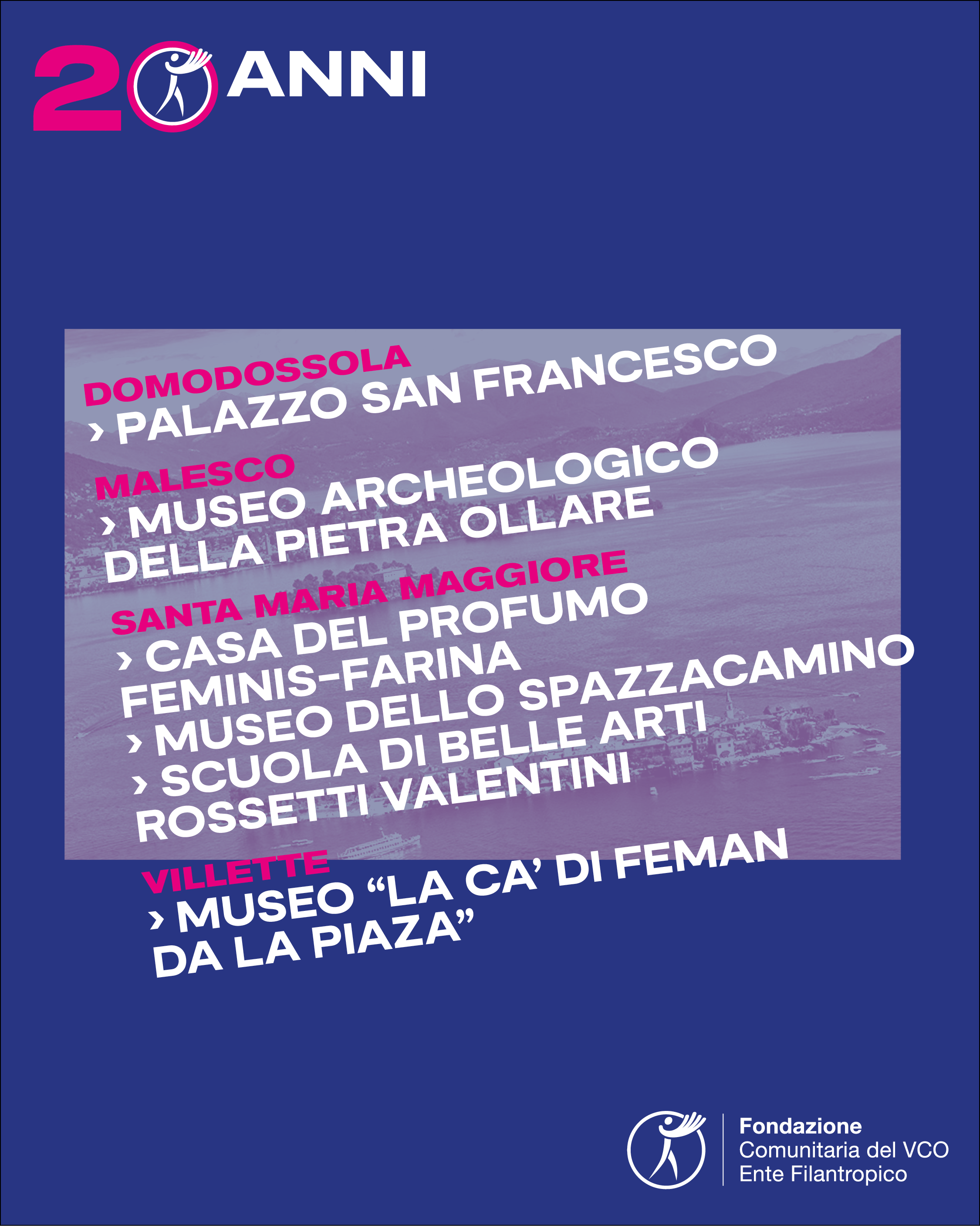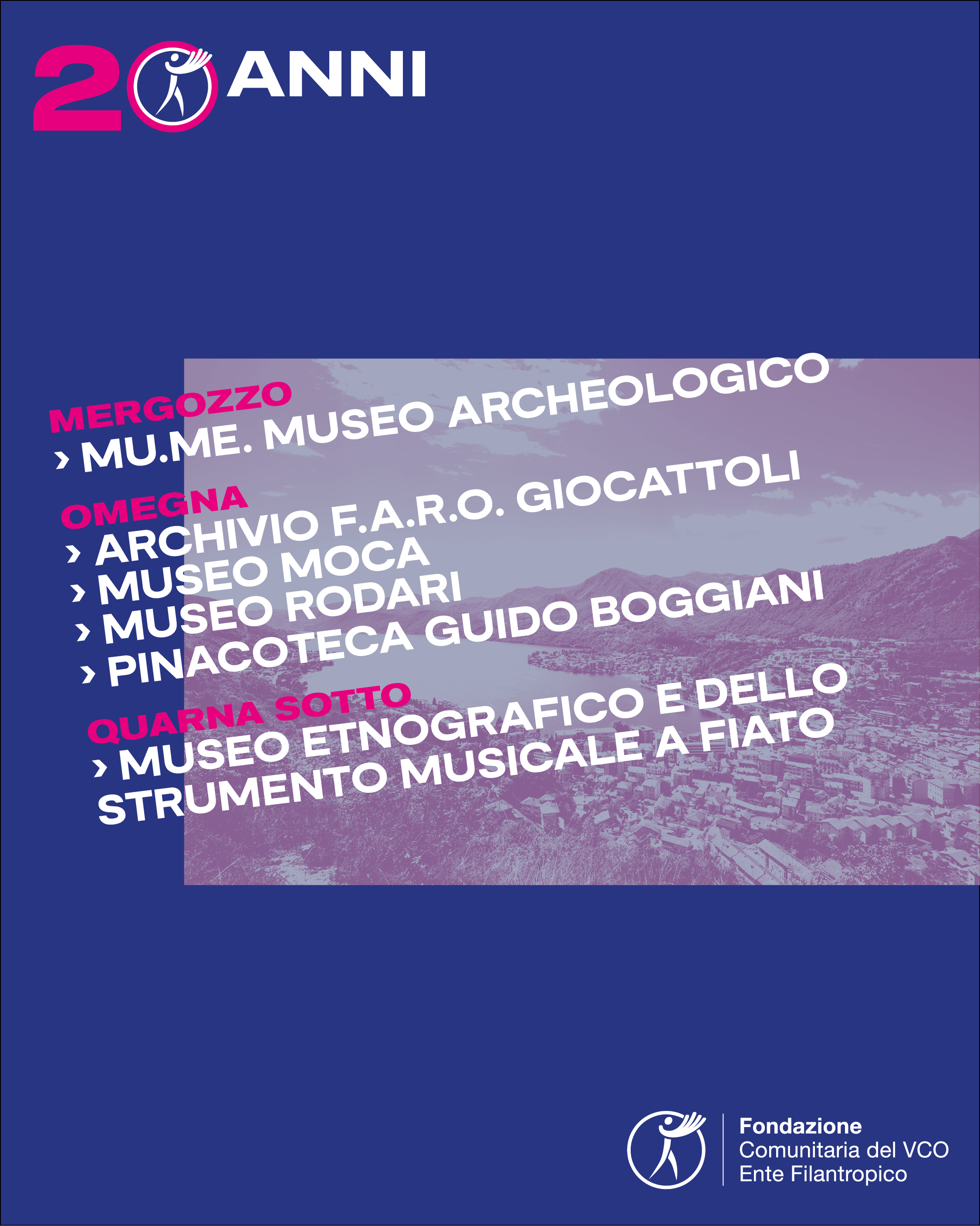 E' con grande piacere che alleghiamo la locandina di un evento diffuso organizzato da Fondazione Comunitaria del VCO, in occasione del raggiungimento del traguardo dei suoi primi vent’anni di attività.