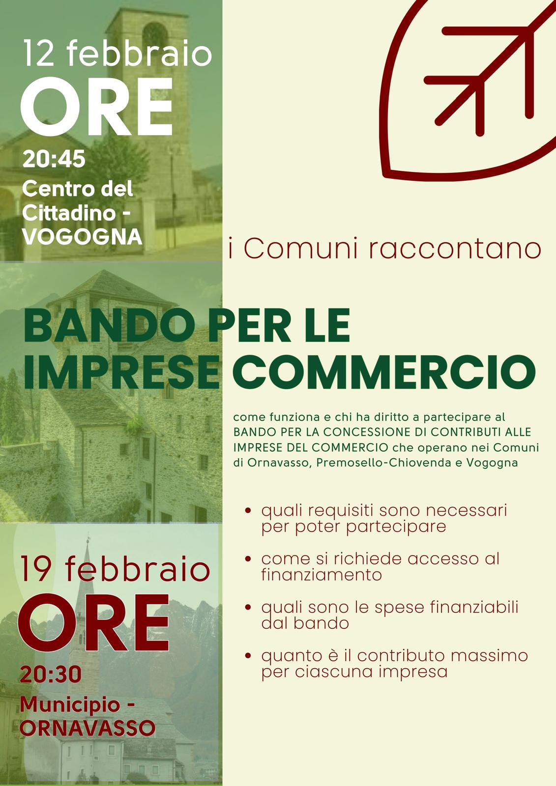 12 febbraio ore 20:45  Centro del Cittadino - VOGOGNA 19 febbraio ore 20:30 Municipio - ORNAVASSO   Bando per le imprese e il commercio. Come funziona e chi ha diritto a partecipare al BANDO PER LA CONCESSIONE DI CONTRIBUTI...