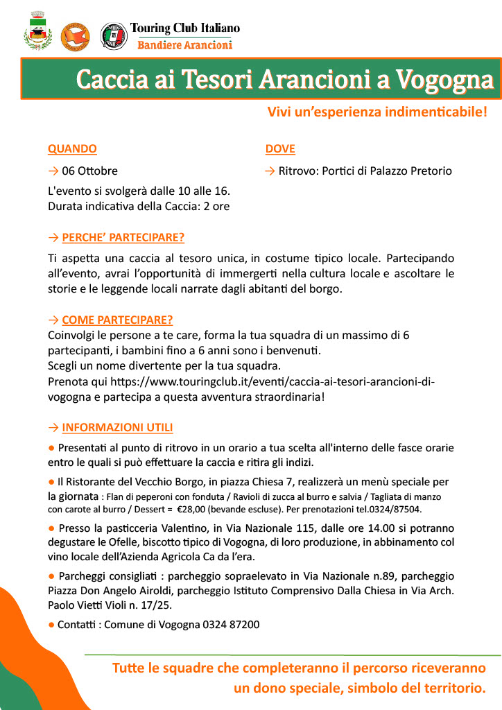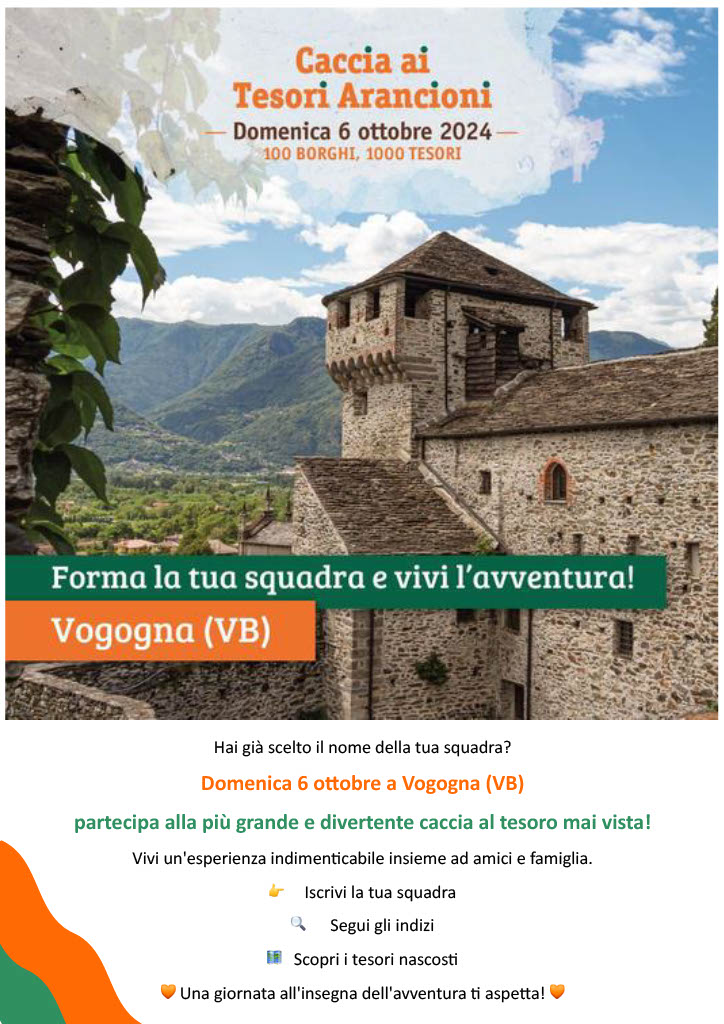 COME PARTECIPARE? Coinvolgi le persone a te care, forma la tua squadra di un massimo di 6 partecipanti, i bambini fino a 6 anni sono i benvenuti. Scegli un nome divertente per la tua squadra. Prenota qui: https://www.touringclub.it/eventi/caccia-ai-tesori-arancioni-di-vogogna e partecipa a questa avventura straordinaria!