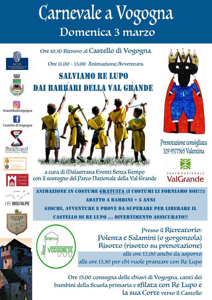 Un evento gratuito per i bambini al Castello alla mattina, polenta (con salamino o gorgonzola) e risotto (quest'ultimo su prenotazione) come nell'antica tradizione vogognese, a mezzogiorno e all'una e mezza. Seguirà la consegna delle chiavi di Vogogna a Re Lupo, così Vogogna, per un giorno, diventerà Luponia! I bambini della Scuola primaria canteranno e poi ci sarà una sfilata per riaccompagnare Re Lupo al Castello.