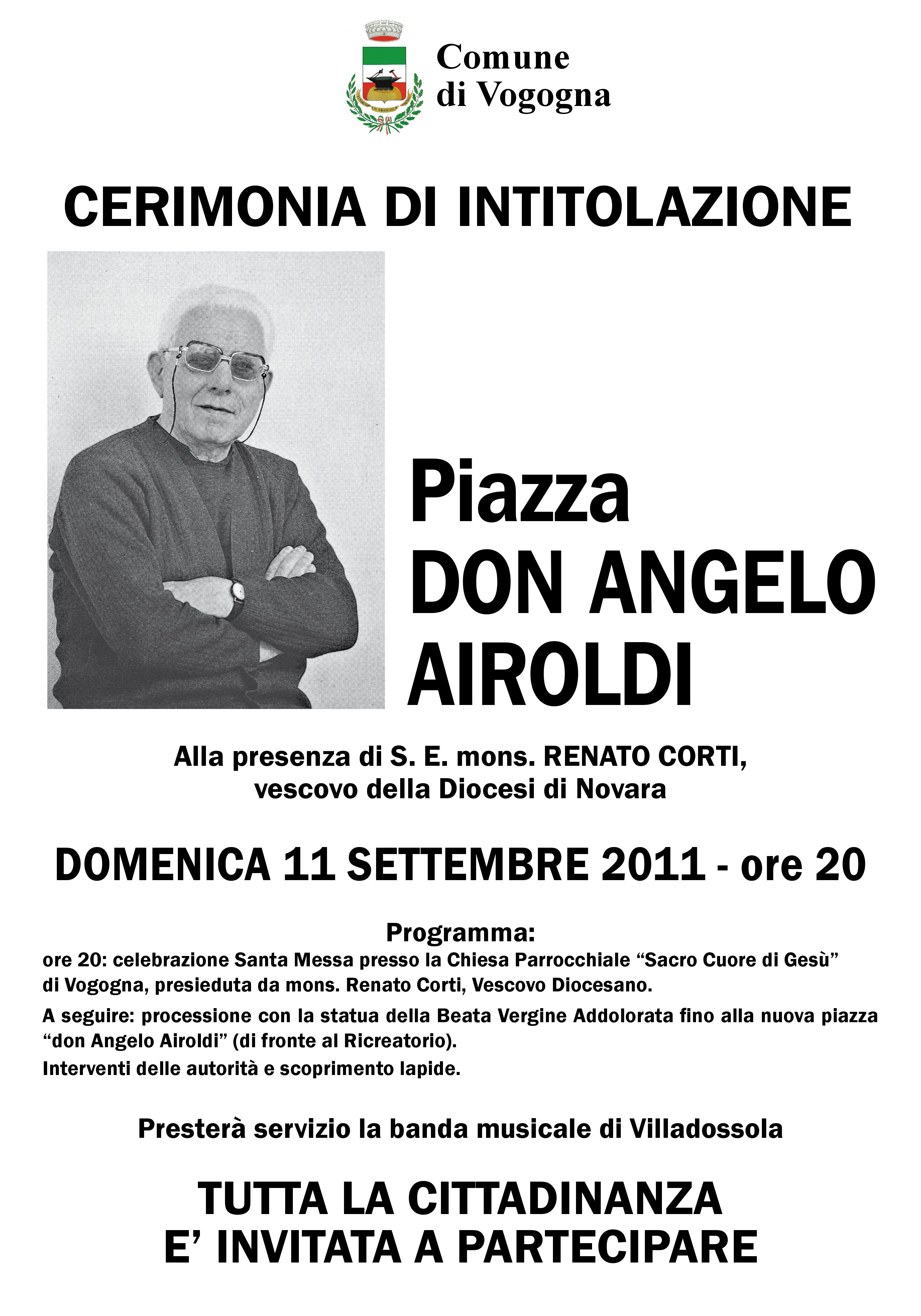 In allegato si pubblica il discorso del Sindaco Borghi che per motivi meteorologici non è stato letto nella serata di inaugurazione della Piazza dedicata a don Angelo Airoldi svoltasi domenica 11 settembre scorso