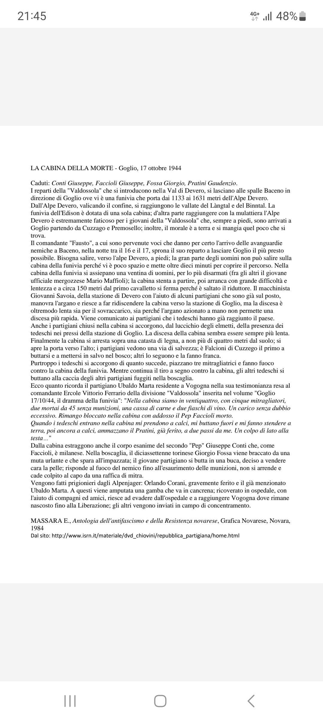 Per meglio rappresentare l’evento storico, si allega il documento “La cabina della morte”, tratto dal libro scritto da E. Massara “Antologia dell’antifascismo e della Resistenza Novarese”.
