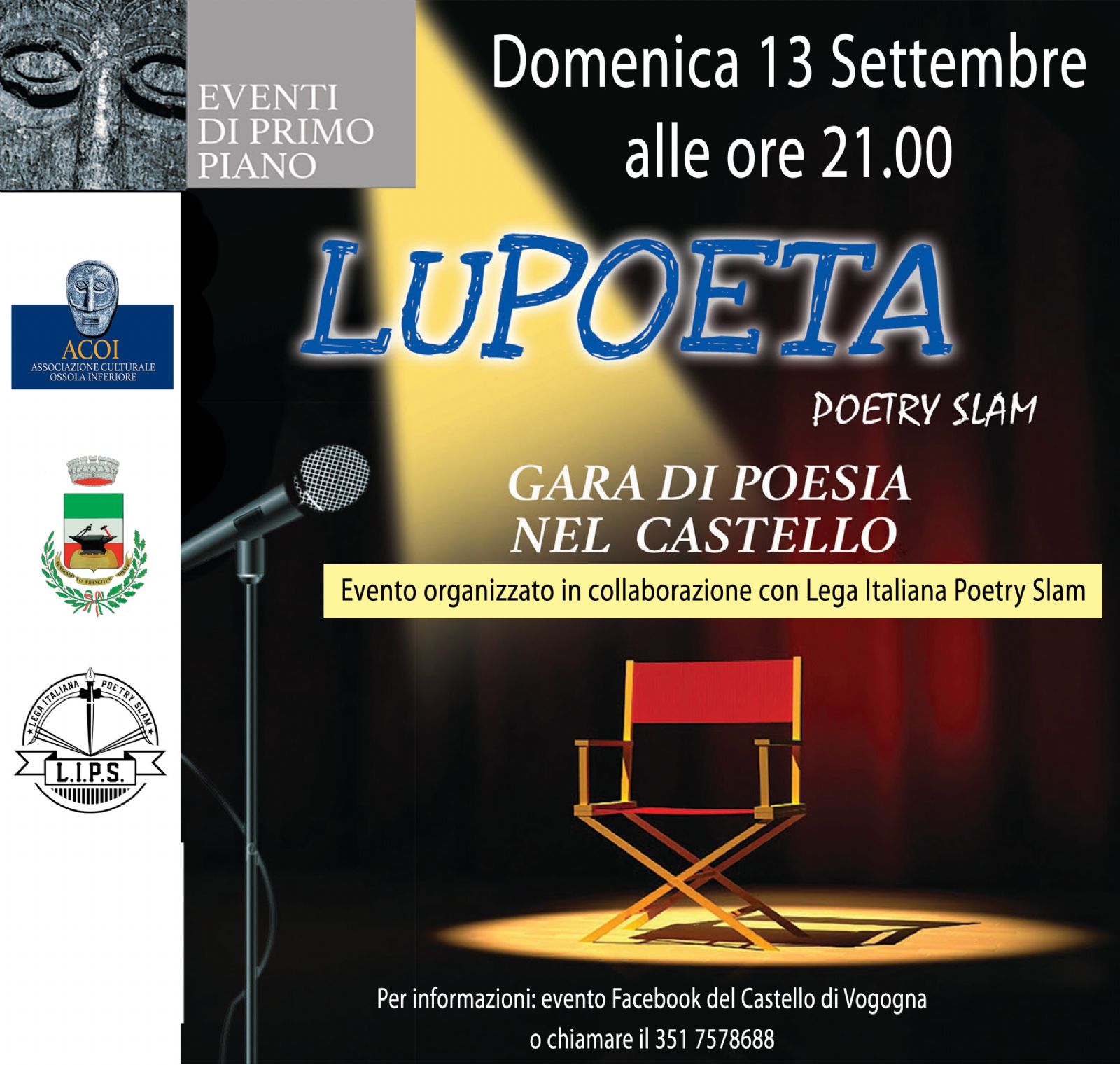 Dopo l’esperienza dello scorso anno, l’ ACOI Associazione Culturale Ossola Inferiore organizza la seconda edizione del Poetry Slam “LUPOETA”, gara di poesia performativa orale adottando le regole della LIPS - Lega Italiana Poetry Slam: